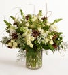 NEW The beauty of the Rocky Mountains woodlands inspired this quietly luxurious arrangement. White spray roses, snapdragons, and other blooms are gathered among winter greenery and festive foliage in a sleek clear glass vase. It’s a gift as sophisticated as it is thoughtful.