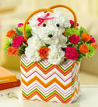 Congratulate the new mommy on her little bundle of joy by sending her a basket full of cuteness. This truly original puppy-shaped flower arrangement, specially made for a great mom like her, is sure to bring a bright smile to her face with colorful carnations, poms and more.