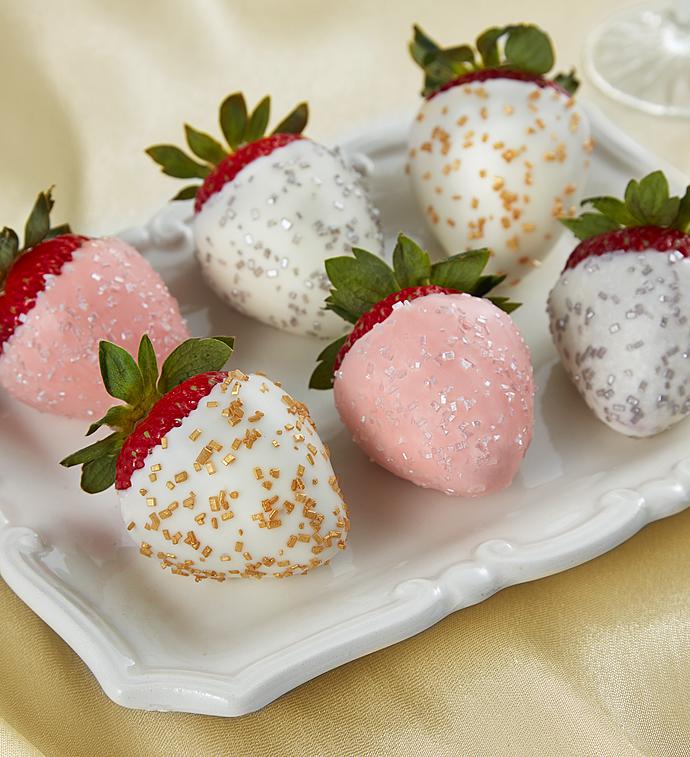 It’s the taste of luxury, of festive parties and elegant revelry, of divine strawberries paired with bubbly champagne! In this lavish collection, each giant, hand-picked strawberry comes generously dipped in creamy white and pink champagne-infused real chocolate and decoratively sprinkled with gold, platinum and clear sugar. Ready to celebrate?