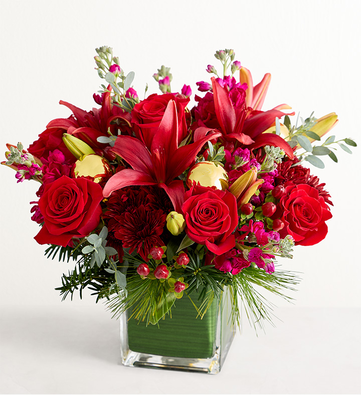 NEW This eye-catching bouquet brings a dash of luxe glamour to their holiday. Brilliant red roses, Asiatic lilies, and other blooms are gathered with Christmas greenery in an asymmetrical arrangement accented with burgundy ball ornaments. Lush with color and texture, this is a sophisticated way to send warm wishes to friends and family.