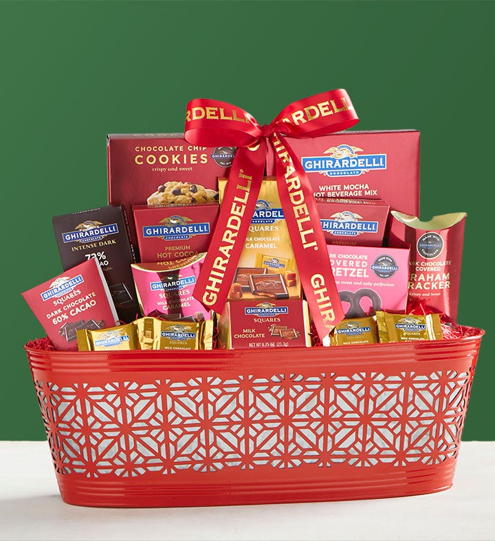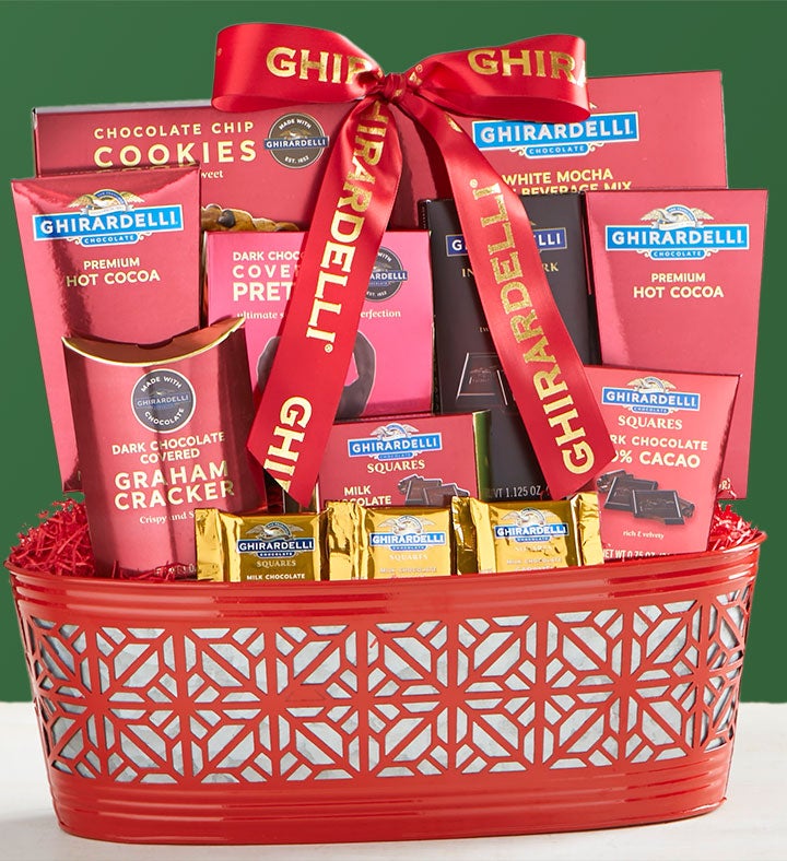 Make someone's holiday delightful with Ghirardelli® under the mistletoe. Nestled inside this impressive Laser Cut Metal Basket is the best collection of classic Ghirardelli® you'll find. Double Chocolate Cocoa Mix, Milk & Caramel Chocolates, Chocolate Chip Cookies, 60% Dark Cacao Chocolates, and so much more makeup this one of a kind Ghirardelli® surprise! Send this impressive basket and they'll be glad you did!