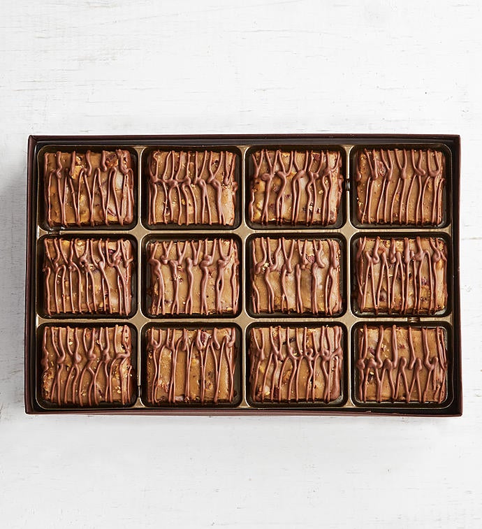 Ethel M still makes their legendary chocolate pecan brittle in small batches. This collection combines the very best of Ethel M Chocolate. First, start with twenty-four pieces of their world-famous pecan brittle. More buttery and softer than most brittle you'll find. Then, they've drizzled premium gourmet chocolate over the top of each piece to make each bite even more perfect than before. The end result is one of the best tasting chocolate delights ever.  This decadent chocolate gift is a favorite of the Simply Chocolate tasting panel.