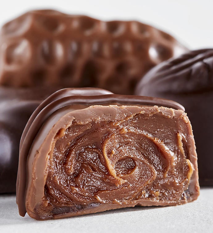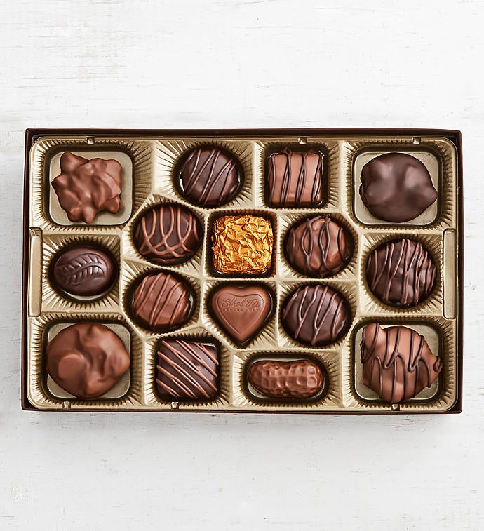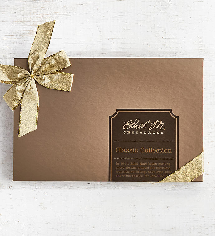This essential Ethel M Chocolates gift assortment contains their 16 most popular specialty premium chocolates including Lemon Satin Crème, Pecan Caramel Rapture, Almond Butter Krisp, Peanut Butter Milk Chocolate, Coconut Delight, and their original copper kettle Chewy Caramels just to name a few. It's the perfect gift to send for any occasion or take a box to the hostess of your next dinner party. These exquisite chocolates are beautifully displayed in a signature gold Ethel M Chocolates box and tied with a shimmery gold ribbon.