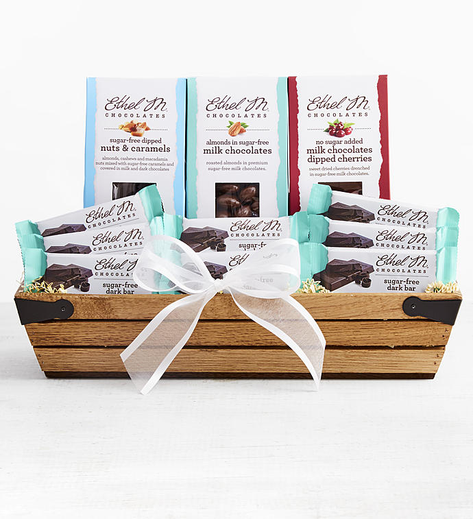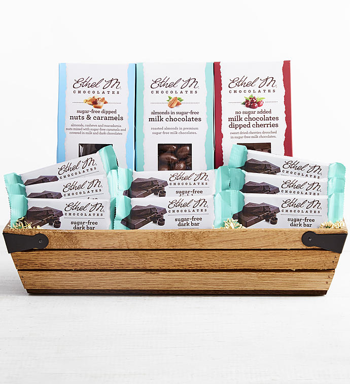 Ethel M's finest collection of sugar free chocolates in a beautiful wood gift crate. For those seeking sugar-free chocolates, look no further. The chocolatiers at Ethel M have brought together their finest collection of sugar-free and no-sugar-added indulgences and packaged them up as the perfect, premium chocolate gift. Inside you'll find Sugar Free Nuts & Caramels, Sugar Free Almonds, No Sugar Added Chocolate Dipped Cherries, and eight Sugar Free Dark Chocolate Bars.