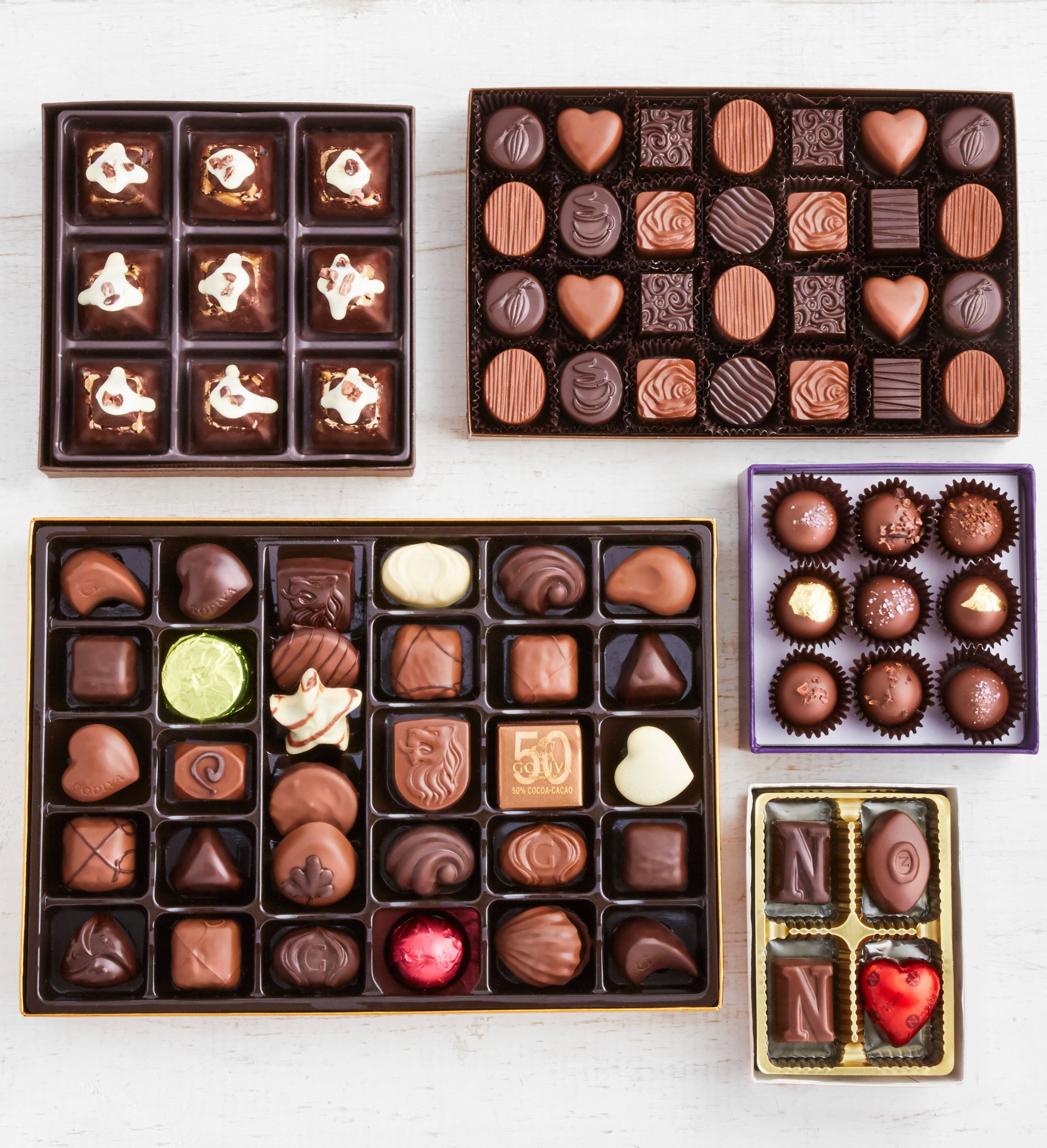 • These artful chocolates feature mouth watering flavors like strawberry rhubarb, sea salt peanut butter, mocha cream, hazelnut, and caramel coconut. All are beautifully presented in a luxurious gift box. Each piece has a design on top that makes it as good to look at as it is to devour. This is a simply wonderful fine chocolate experience!
