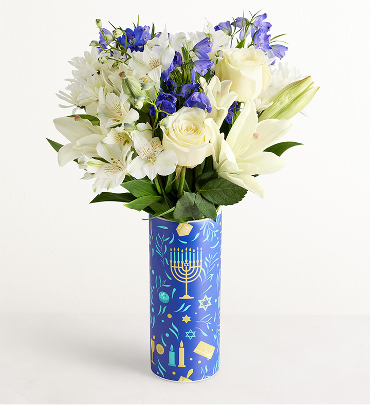 NEW An ideal accompaniment to a menorah and latkes, our keepsake dolomite vase is decorated with symbols of Hanukkah. Accompanying the vase is a white-and-blue bouquet featuring roses, lilies, and other blooms certain to add to the holiday joy.