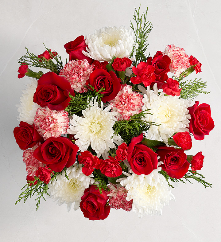 Give the gift of joy with our festive mix of blooms. This red and white arrangement delivers a warm holiday feel, while adding a beautiful touch to any gathering.