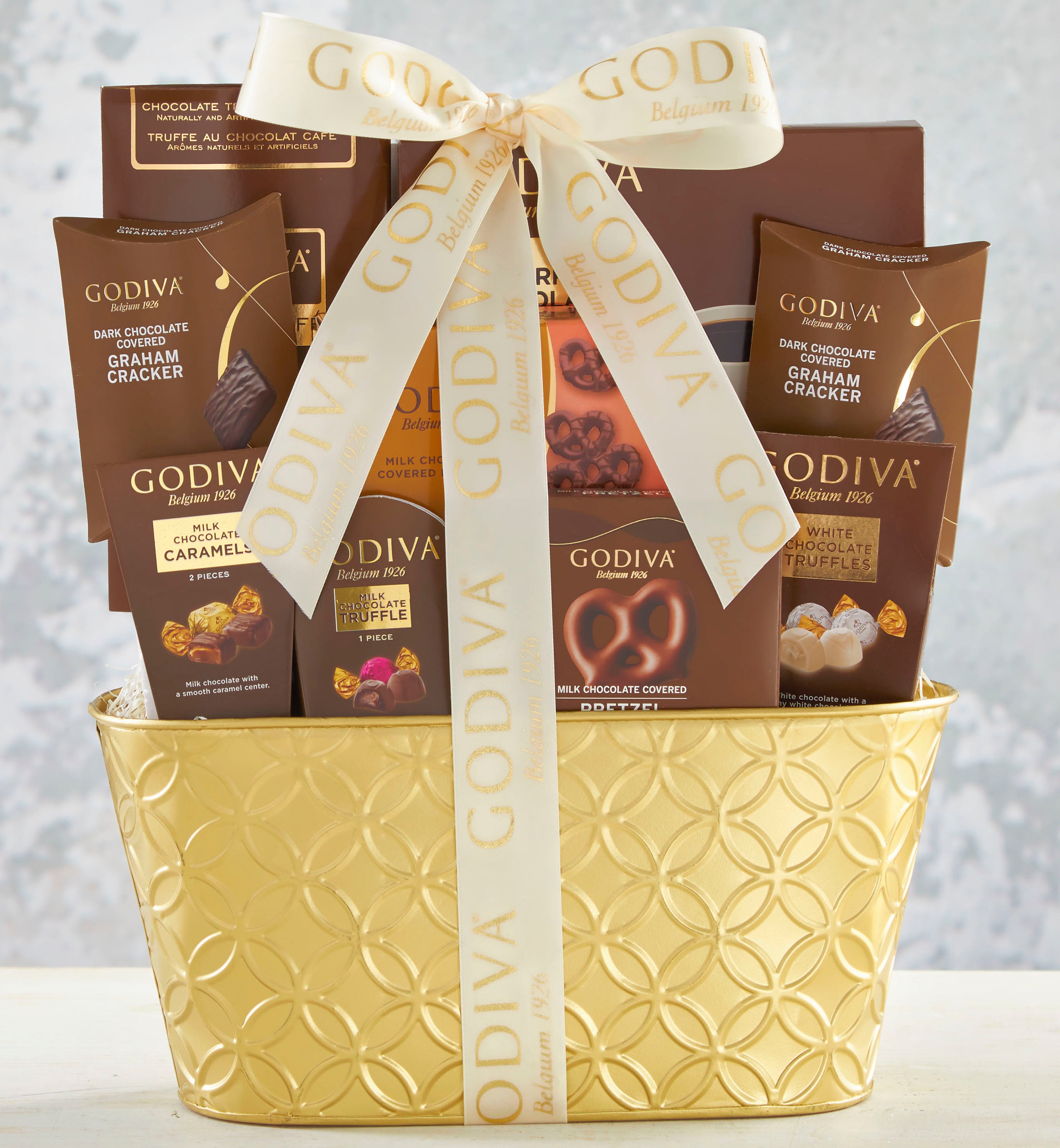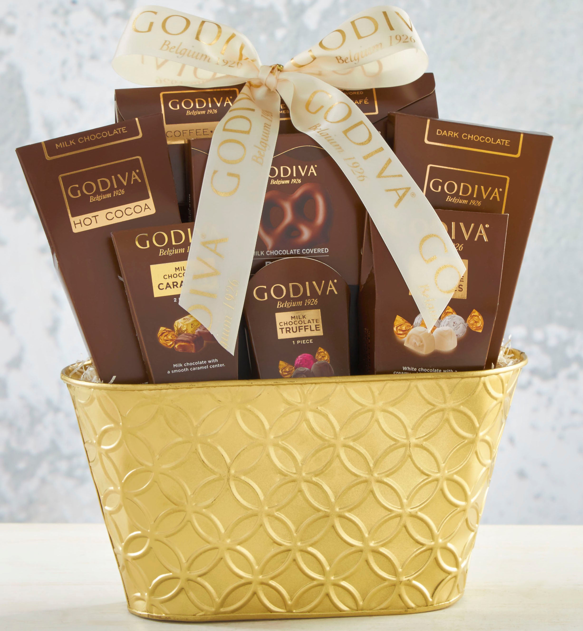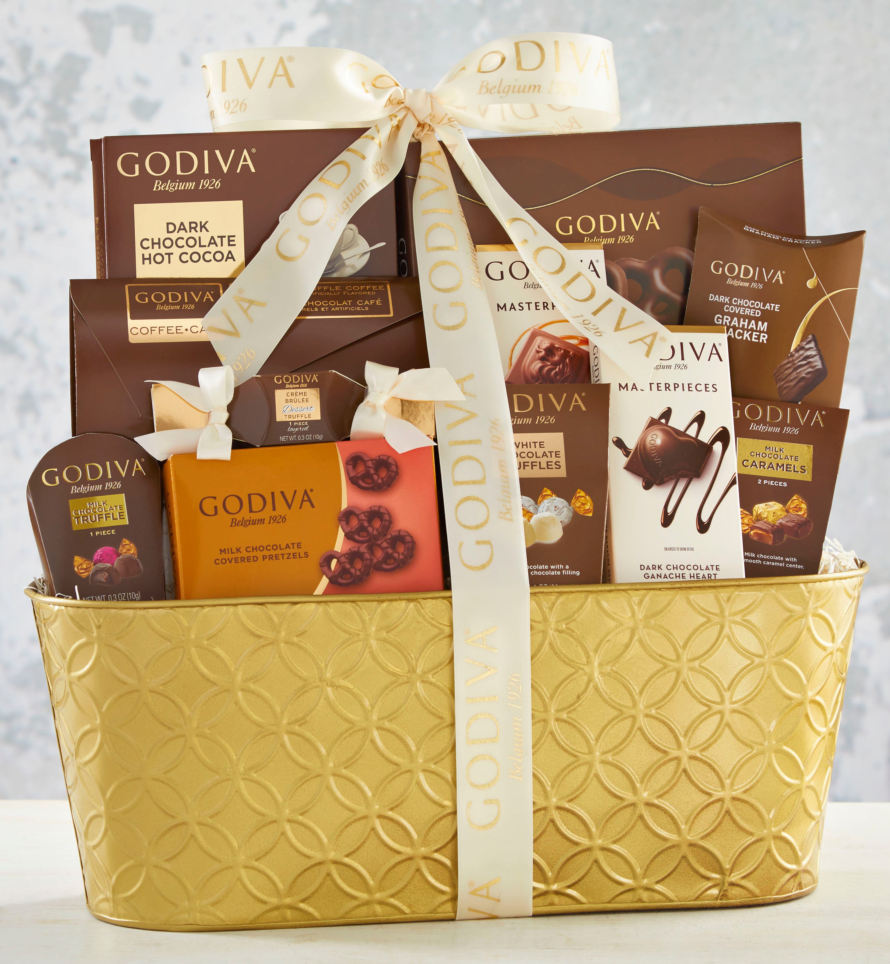 Filled with divine delights, this glitzy gold gift basket contains a wealth of decadent Godiva® treats, including Chocolate Truffles, Milk Chocolate Pretzels, Milk Chocolate Caramels, Dark Chocolate Cocoa and more! Choose from our divine Deluxe, our glorious Grande or our stupendous Supreme Baskets.