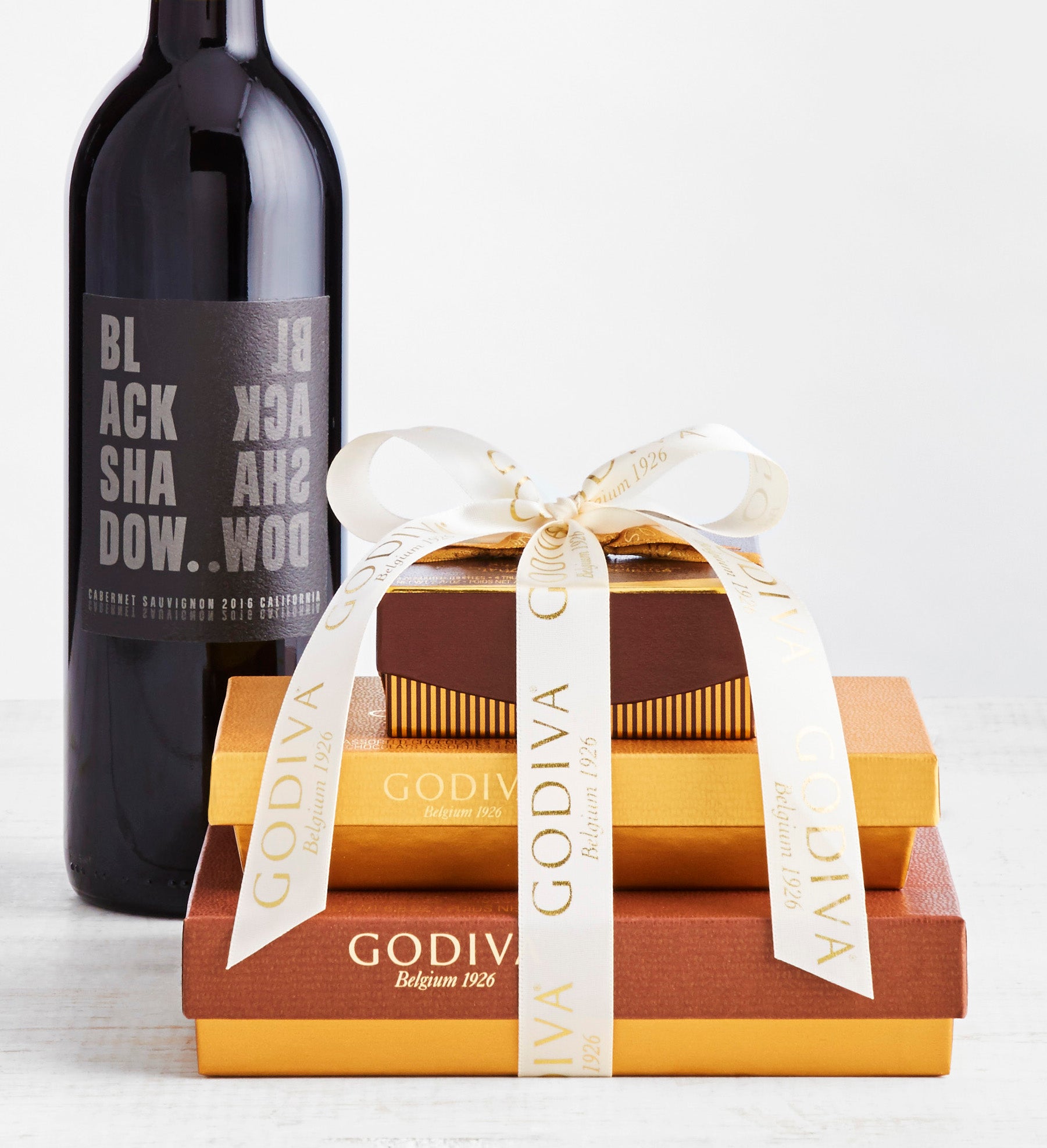 For the true Godiva® lover in your life, this is truly a deluxe gift to send them a piece of sweet chocolaty serenity. A collection of divine Godiva® treats that create this scrumptious tower. Tied together with a stunning white and gold Signature Godiva® bow includes Godiva® Gold Ballotin Chocolates Box, Godiva® Milk Chocolate Assortment Box, and Godiva® Signature Truffles. Perfect tower to send and impress the chocolate enthusiast in your life, paired with a wonderful 2016 Cabernet Sauvignon from Black Shadow. The gift to let them indulge and enjoy!