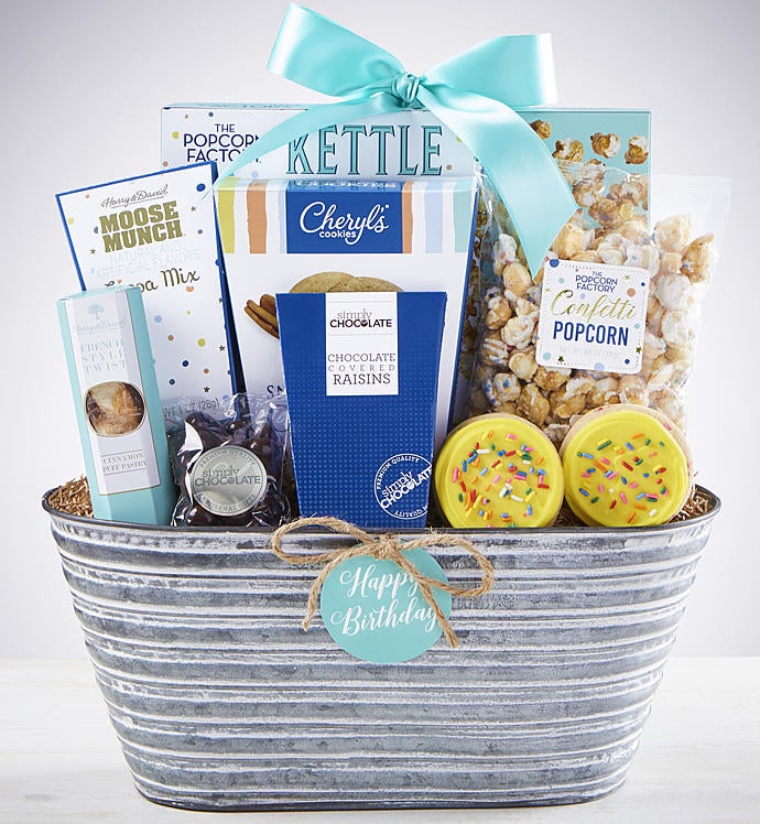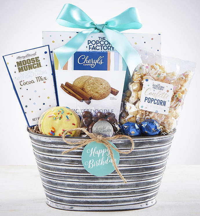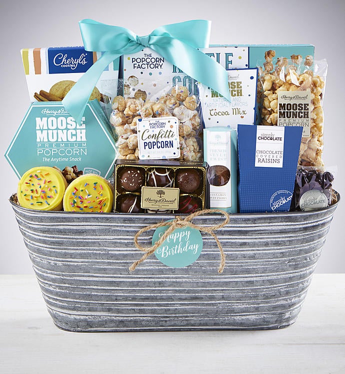 Wish a special someone a Happy Birthday! by sending this cheerful gift basket. Filled with a sweet arrangement of treats to put a smile on their face! These wonderful baskets are brimming with fun delights, like Harry & David® Milk Chocolate Truffles, Simply Chocolate® Chocolate Covered Peanuts, Cheryl's Frosted Cake Cookies and so much more. Complete with a Happy Birthday tag, this will make their birthday memorable!