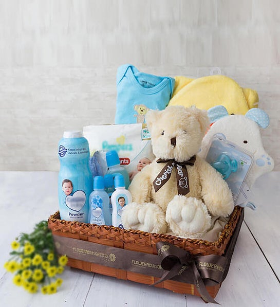 Every baby boy deserves this cute hamper for being born to this world Please order 2 days in advance. Brand, Bear, wrapping, decoration, and packaging/vase may vary. FlowerAdvisor reserves the right to replace any item with another of equivalent value depending on season and availability.