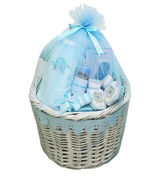 Add a splash of joy to the proud parents with this attractive baby gift. A round decorative basket is blooming with a baby body suit, shoes, socks, baby bottle, baby teether and more. Wrapping, bear, decoration, packaging/vase and fillers may vary. FlowerAdvisor reserves the right to replace any item with another of equivalent value depending on season and availability.