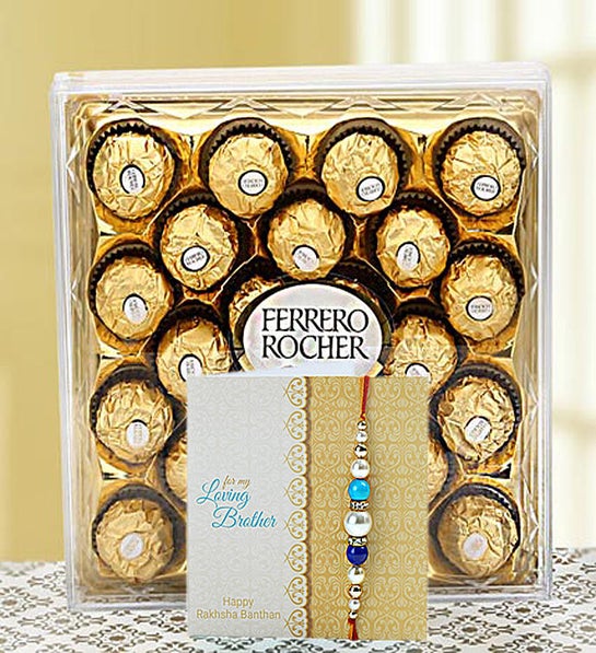 Premium Rakhi Gift for brother a 300grams ferrero rocher with rakhi and roli chawal EXPRESS DISCLAIMER : 1. Orders received till 6 pm IST on 6th Aug. will be delivered on or a day before Rakhi. 2. We will attempt delivery of the items once. In case the delivery is not executed during the attempt,due to wrong address/recipient not available/premises locked, the customer shall still be charged for the order. 3. Please note that Flowers, Cakes, Sweets, chocolates and other perishable products are sourced locally at the delivery location & will be hand delivered. 4. The image displayed in indicative in nature. Actual product may vary in shape or design as per the availability. 5. We reserve the right to substitute the sweets, Basket, Rakhi & other products with equal value or higher value due to temporary, regional availability issues.