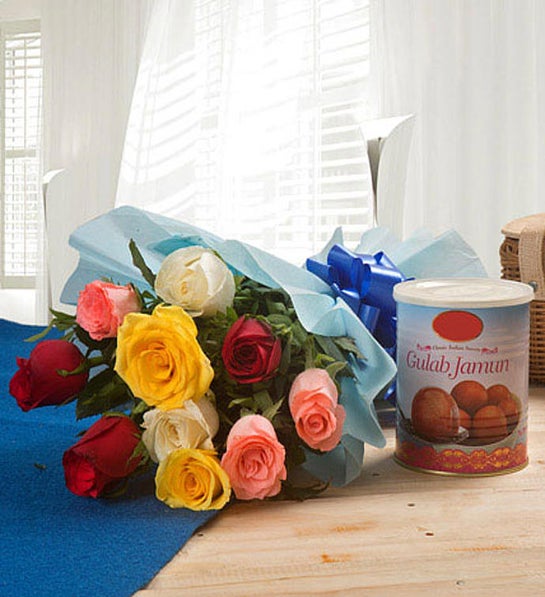 exclusive hamper that includes a 10 mixture of red, yellow, white and pink roses along with a 1Kg gulab jamun tin
