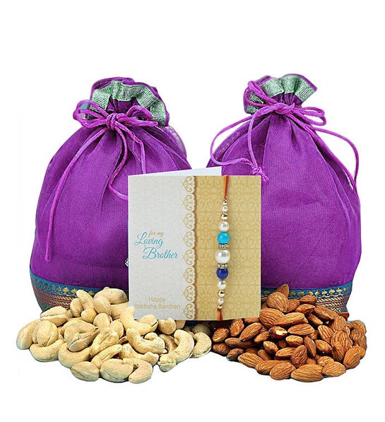 This Rakhi send 250gms almonds, cashews in potli each with rakhi and Roli chawal EXPRESS DISCLAIMER : 1. Orders received till 6 pm IST on 6th Aug. will be delivered on or a day before Rakhi. 2. We will attempt delivery of the items once. In case the delivery is not executed during the attempt,due to wrong address/recipient not available/premises locked, the customer shall still be charged for the order. 3. Please note that Flowers, Cakes, Sweets, chocolates and other perishable products are sourced locally at the delivery location & will be hand delivered. 4. The image displayed in indicative in nature. Actual product may vary in shape or design as per the availability. 5. We reserve the right to substitute the sweets, Basket, Rakhi & other products with equal value or higher value due to temporary, regional availability issues.