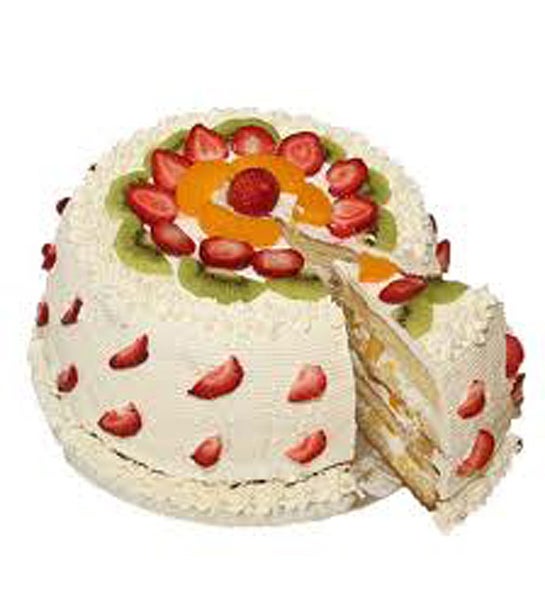 Deliciously fruity offering of vanilla cake with cream and sumptuous decorations of sweet strawberries, kiwi, and orange!