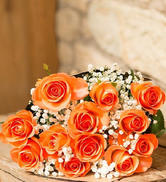 Lovely orange roses, they are a popular expression of admiration and respect. Perfect for any occasion, this beautiful dozen orange rose bouquet is carefully arranged with gypsophila and delivered to your lucky recipient.