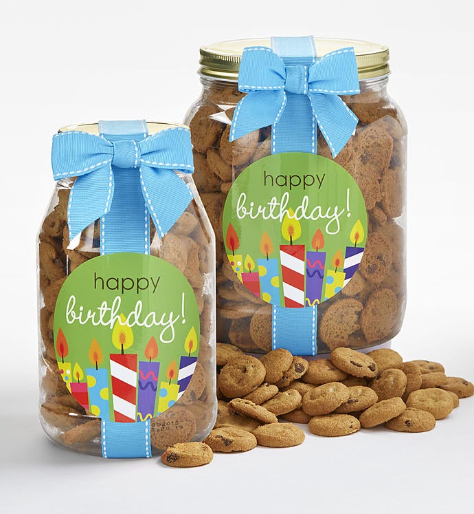 Make someone feel special on their big day with this delightful Birthday Cookie Jar! Filled with the tastiest mini-chocolate chip cookies they'll ever eat and bottled in a reseal-able plastic jar tied with a bright blue ribbon! Choose from the medium quart jar or the large half gallon jar.