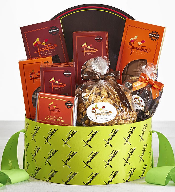 All the chocolate essentials from James Beard award-winning pastry chef, Jacques Torres! This Simply Chocolate Exclusive Jacques Torres Gift Box is the perfect gift and party companion. Gift Set Includes: House Blend Bar 60%, Milk Chocolate Bar, Mini Coffee Bar, Milk Chocolate Cheerios (CHEERIOS is a registered Trademark of General Mills), Dark Chocolate Corn Flakes, dark chocolate almonds, caramel popcorn, dark bark.