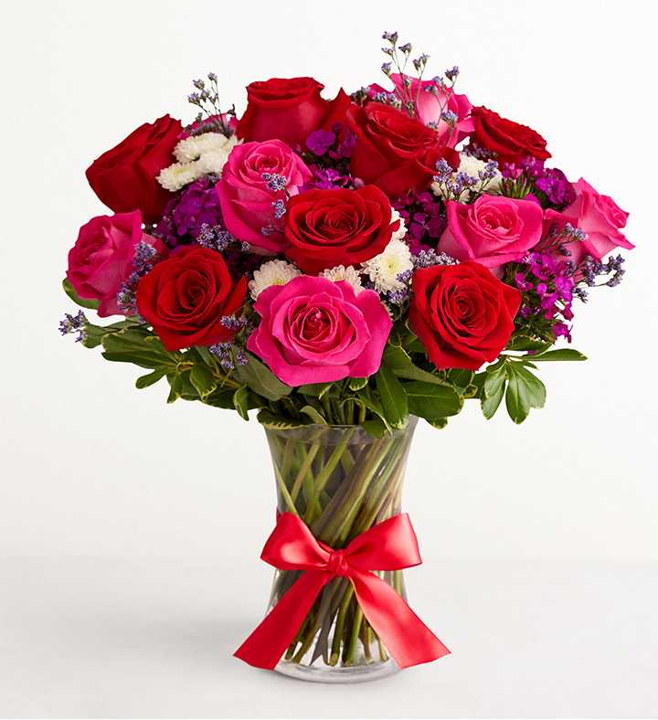 Red is the color of passion, which makes this bouquet a spectacular gift for the one who makes your heart race. Red and pink roses are accented with other blooms and arranged in a clear glass vase tied with a red satin ribbon, creating a gift that will leave them in no doubt of your feelings.
