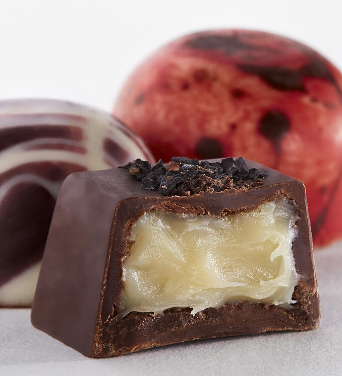 - Kelly® Strawberry and lemon-thyme white chocolate ganache in 65% house blend dark chocolate