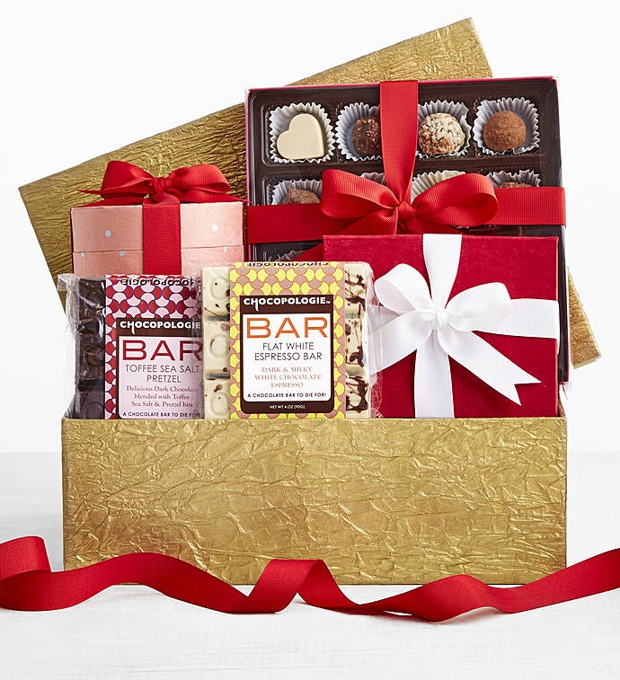 • These premium chocolates are packed with cushioning paper inside the textured gold keepsake box and the box is tied with a red grosgrain ribbon for a beautiful gift box presentation.