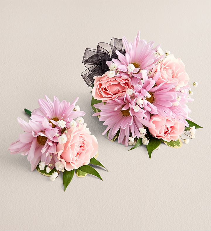 NEW Make a dazzling entrance with this corsage and boutonniere pairing, available in two sizes, featuring pink spray roses with lavender daisies. Each corsage comes with a ribbon bow in your choice of white, silver, gold, or black and can be worn on the wrist or pinned to clothing.
