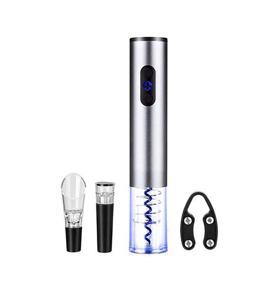 Electric Wine Bottle Opener with Foil Cutter, Vacuum Stopper, and Aerator Pourer to enhance your wine tasting experience. Effortlessly remove a cork in just 4 seconds. Unlock your wine’s full potential using the aerator pourer. Includes fresh vacuum seal stopper and foil cutter. Operates with 4 AA batteries.
