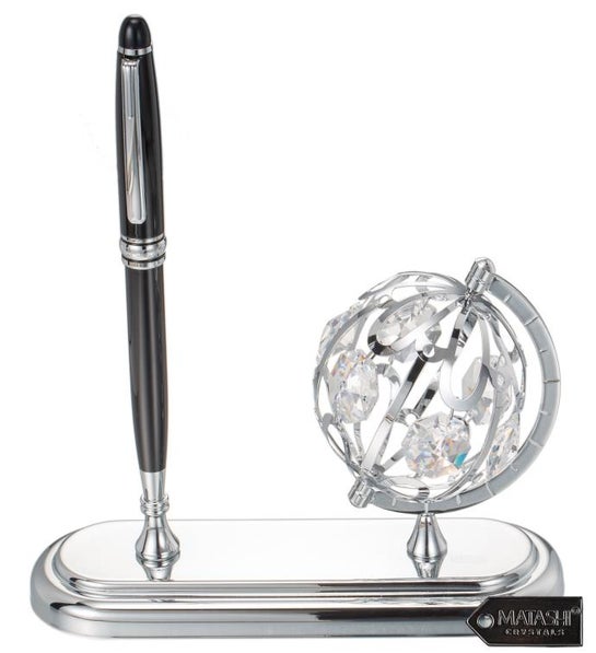 A sleek, banded pen rests in its base. A globe sits alongside the pen, sharing a tasteful Highly Polished base. The stunning figurine along with the stylish pen is crafted with quality materials like Tarnish Resistant chrome and decorated with authentic precision cut crystals. Truly functional elegance, give it as a gift or use it in your office!