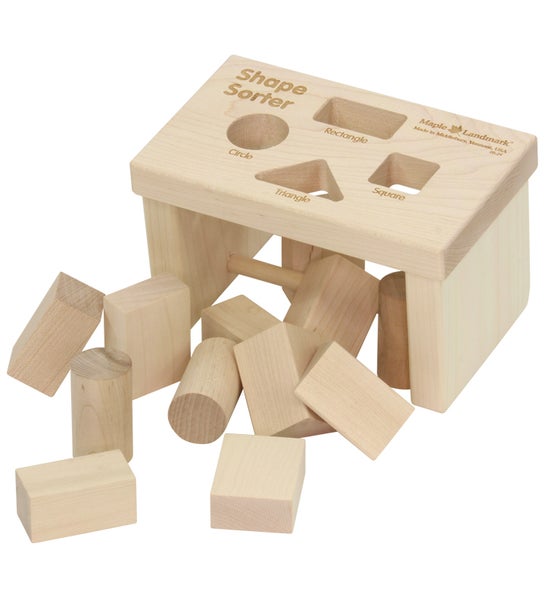 Twelve blocks in four primary shapes match to their corresponding holes: circle, square, rectangle, and triangle.
