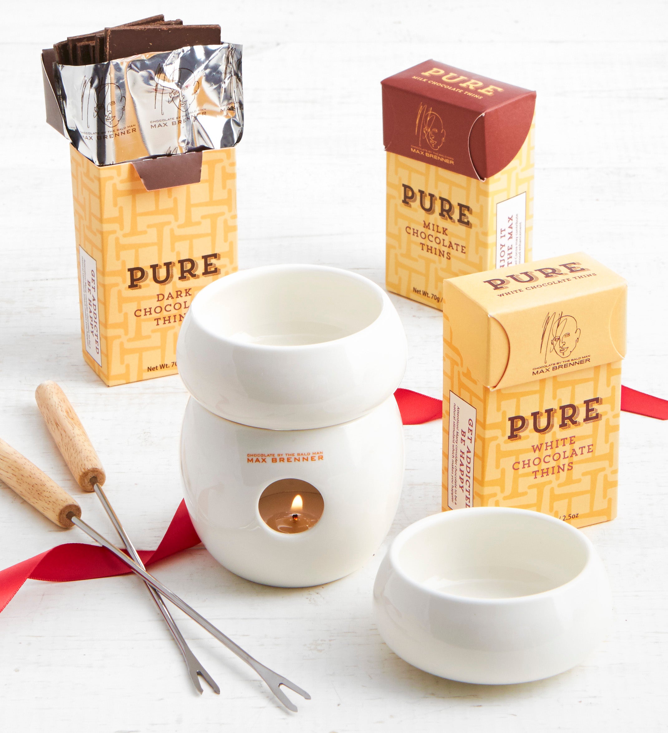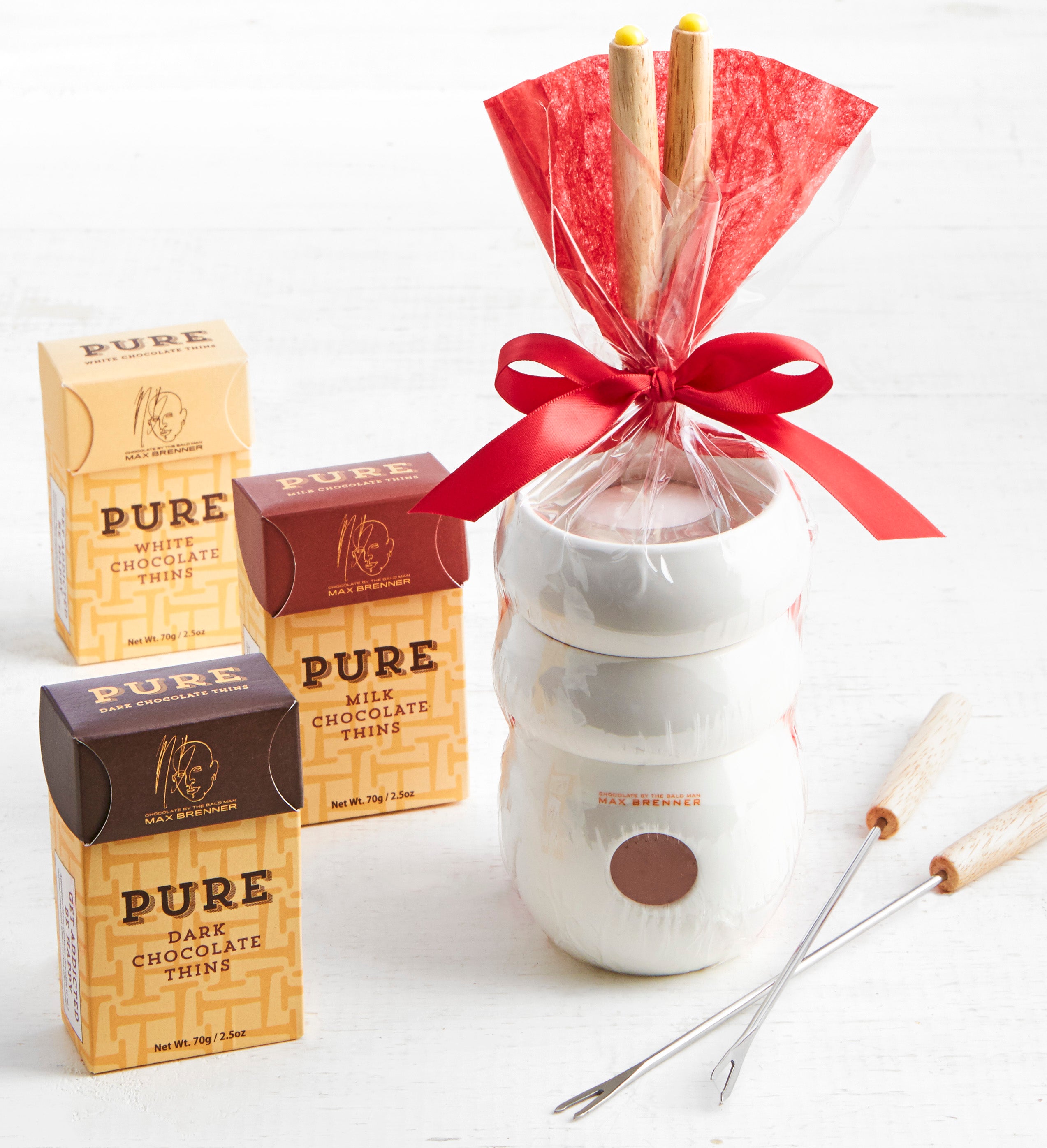Served worldwide at Max Brenner's Chocolate Bars, this unique 3 tiered fondue set is perfect for chocolate lovers. This Simply Chocolate exclusive chocolate & ceramic set features a middle tier to hold hot water for a gentle stress-free melt of the chocolate allowing for a velvety smooth luscious texture.  Enjoy fruits, marshmallows, cake chunks, nuts and more when dipped in Max Brenner chocolate.  This set includes 2 fondue forks and 3 boxes of Pure Chocolate Thins - Milk, Dark, and White chocolate. Kosher.