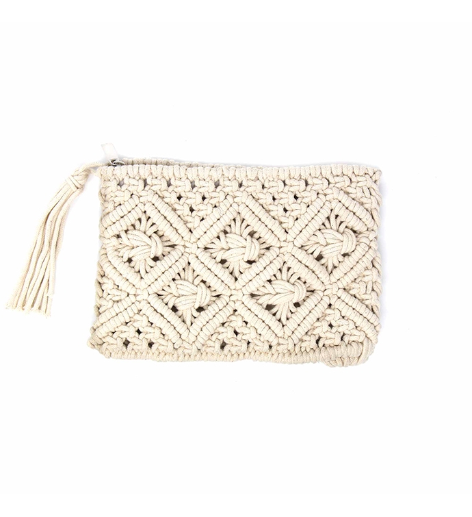 Handmade by skilled artisans in India, this natural-colored macramé clutch is the perfect complement to any outfit. The bag has a zipper close and the inside is lined. It features a tassel that is a great design touch. Perfect for day or evening.