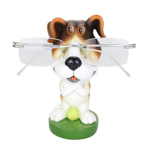 Hound with a mischievous look on his face, standing over a ball eyeglass holder. Dog stands with crossed arms, great gift for the hound dog lover in your life.