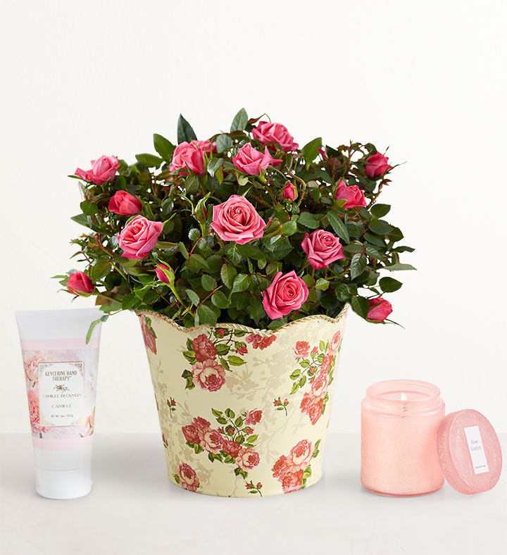 NEW Our pink rose plant is a true classic. Designed in a rose-patterned planter with an elegant gold scalloped rim, it brings timeless beauty to the home or garden. Complement your gift by adding our rose-scented soy-wax candle on its own or bundled with soothing hand lotion from Camille Beckman® in a signature floral fragrance.