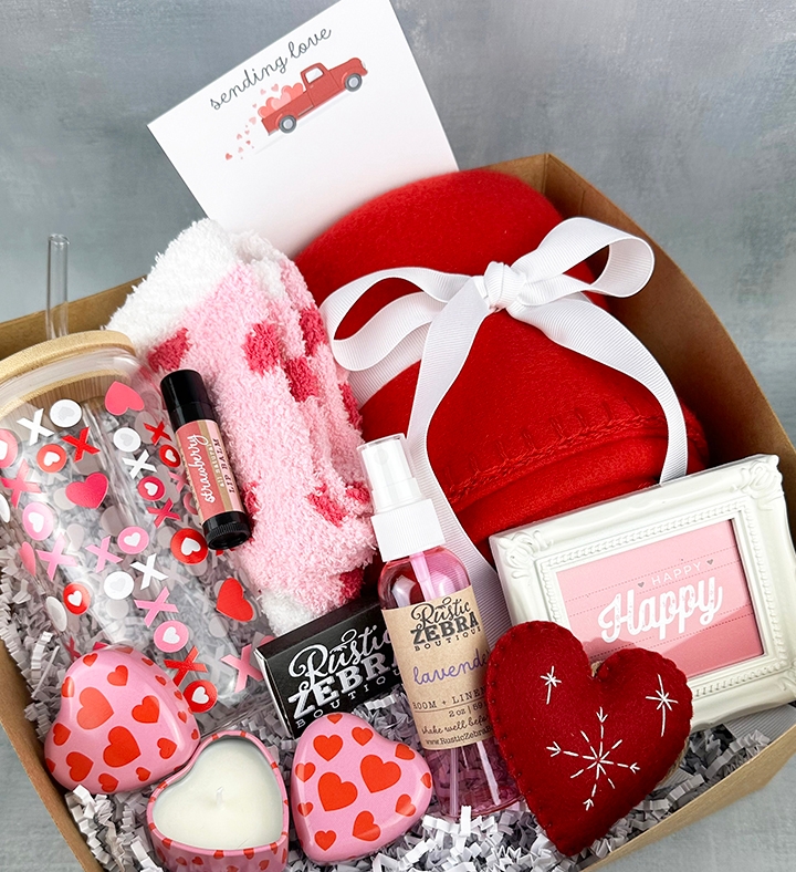 This deluxe gift set includes two hand-poured soy tea light candles in heart-shaped tins with sea salt orchid and grapefruit + mint scents, a custom box of matches, a valentine glass water bottle, all-natural strawberry lip balm, fluffy valentine spa socks, a red fleece blanket, a white frame, a red felt heart, lavender linen spray, and a custom greeting card with your personal message. Perfect for cozy self-care or thoughtful gifting, it combines relaxation, comfort, and a personalized touch in one charming package.