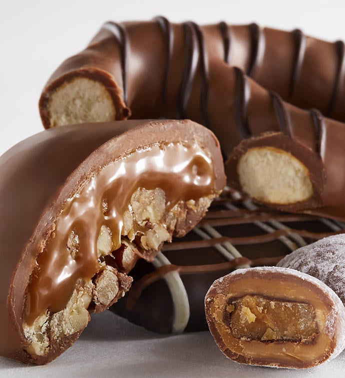 This distinctive gold gift box is a chocolate lover's dream! They will unwrap the signature Simply Chocolate logo ribbon to discover a treasure trove of chocolate delights including Chocolate Butter Almond Toffee, Chocolate Peanut butter Toffee Balls, Dark Chocolate Caramel Pretzel Clusters, and Chocolate Maple Brown Sugar Caramel Balls. Truly Impressive and delicious!
