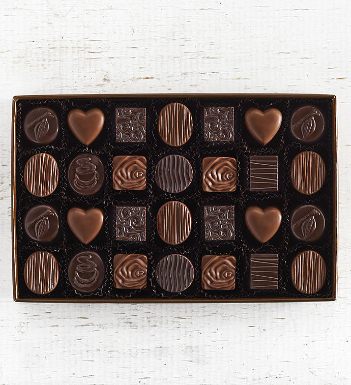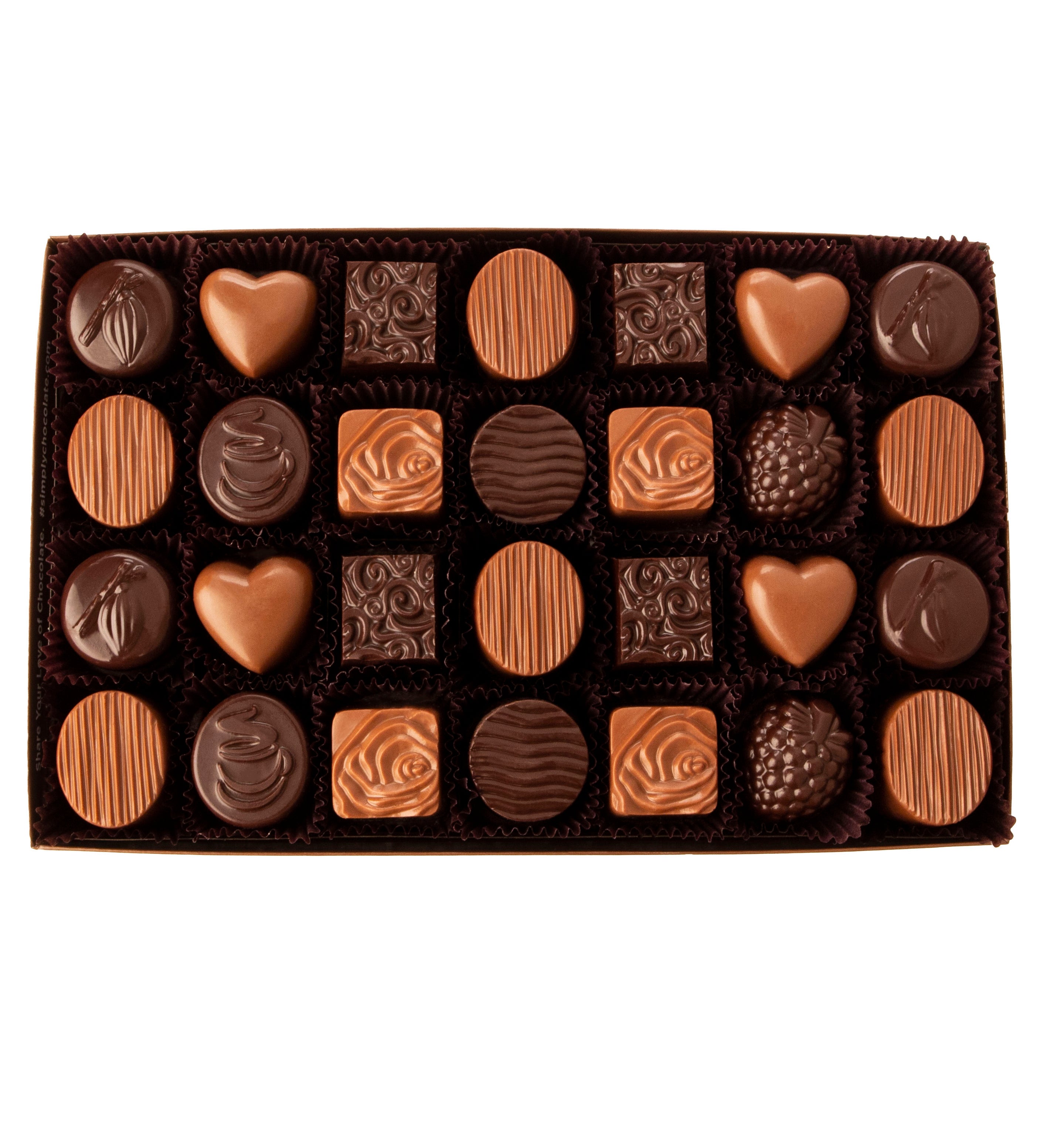 Our team at Simply Chocolate has spent countless hours working with an artisan chocolatier to perfect this tantalizing assortment. These artful chocolates feature mouth watering flavors like strawberry rhubarb, sea salt peanut butter, mocha cream, hazelnut, and caramel coconut. All are beautifully presented in a luxurious gift box. Each piece has a design on top that makes it as good to look at as it is to devour. This is a simply wonderful fine chocolate experience!