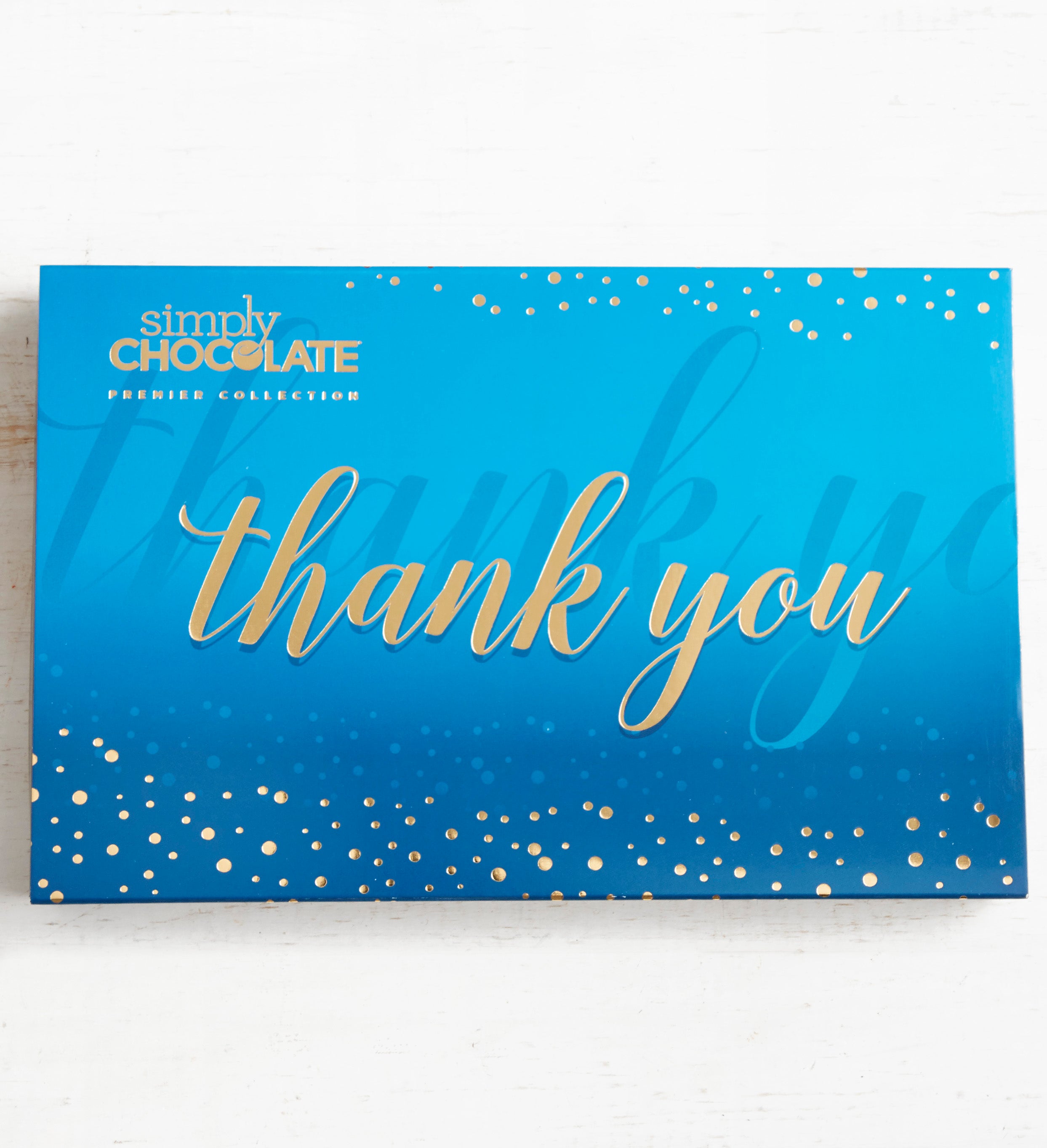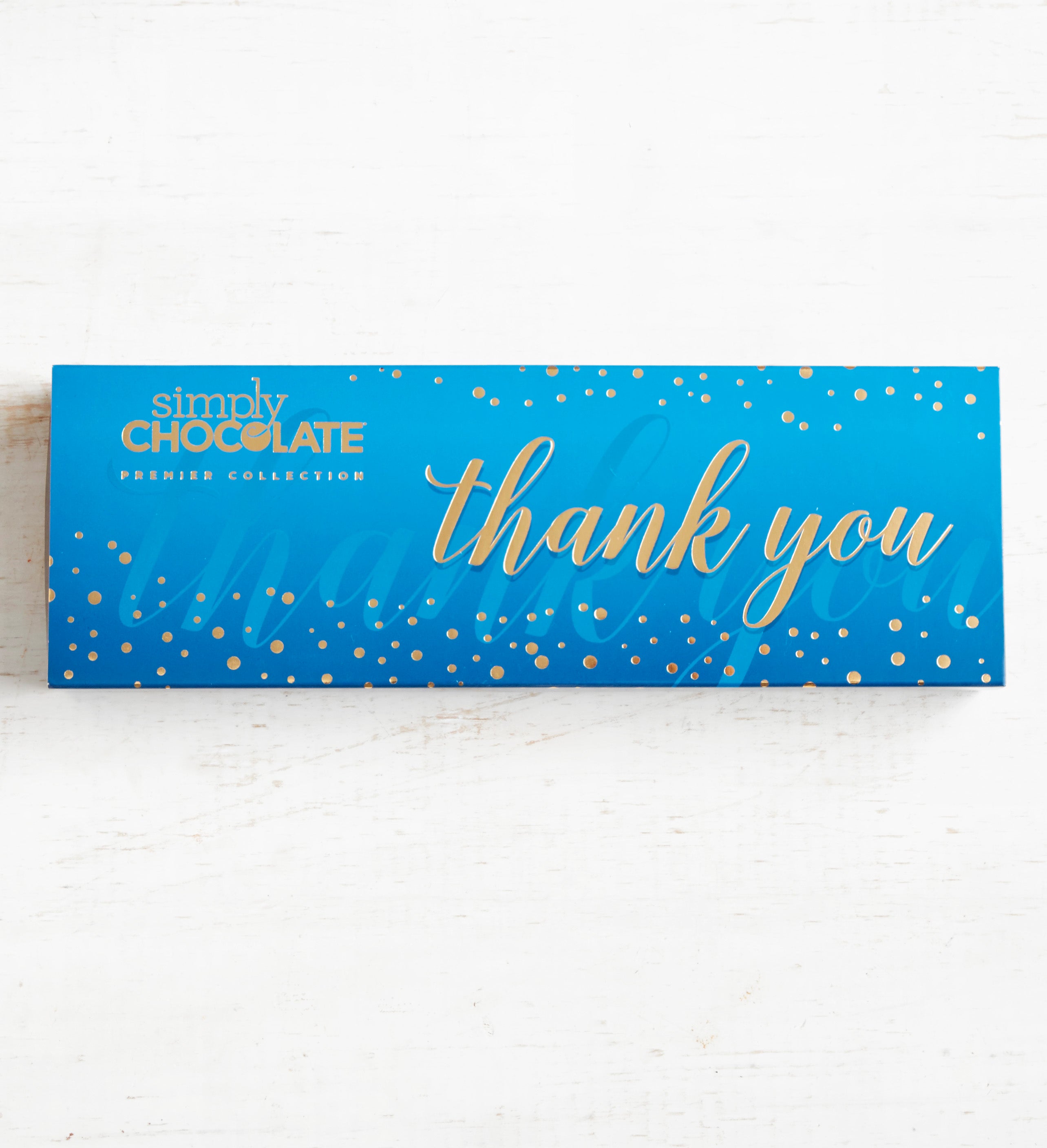 Our team at Simply Chocolate has spent countless hours working with an artisan chocolatier to perfect this tantalizing assortment. These artful chocolates feature mouth watering flavors like strawberry rhubarb, sea salt peanut butter, mocha cream, hazelnut, and caramel coconut. The Thank You cover slides off to reveal a luxurious gift box.