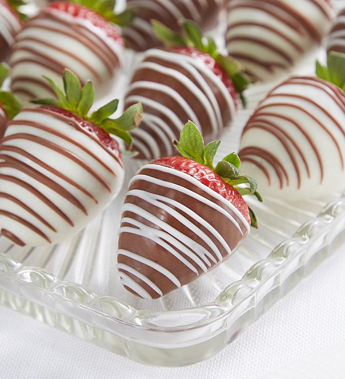 Real Love Deserves Real Chocolate®! Strawberries are enrobed in delicious 100% Real Milk, Dark & White Chocolate. Chocolate Strawberries include Milk chocolate with white chocolate drizzle, white chocolate with milk chocolate drizzle and dark chocolate with white chocolate drizzle.