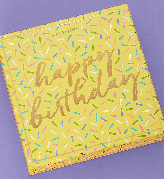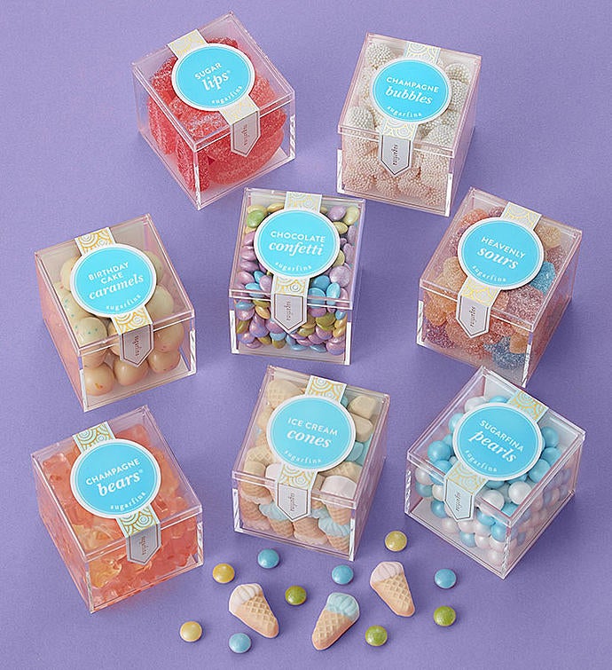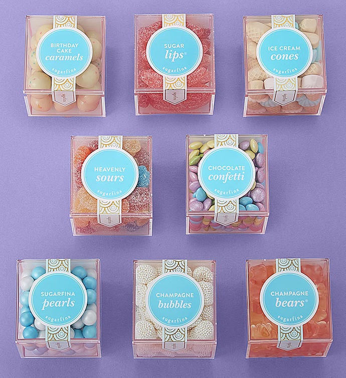 Make their birthday even sweeter with this sparkling gift box of amazing birthday candies. Includes eight adorable lucite boxes of Sugarfina's most popular sweets including Champagne Bears®, Ice Cream Cones, Birthday Cake Caramels, Chocolate Confetti, Sugarfina Pearls and more. They are beautifully packaged in a festive confetti pattern keepsake box that says "Happy Birthday" in shimmery gold foil. Sugarfina, founded by a couple who love candy and each other, was named one of the world's 50 most innovative companies in 2018 by Fast Company. Celebrate deliciously!