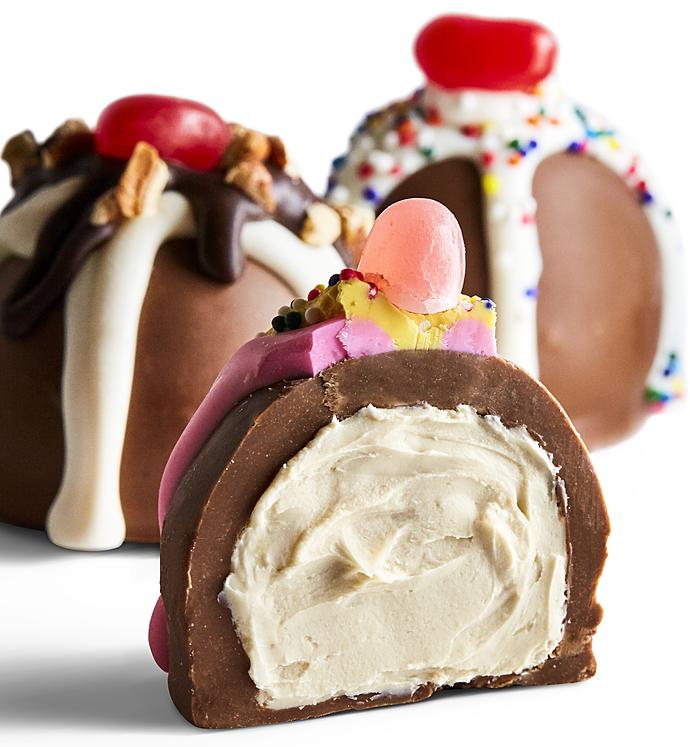 Celebrate deliciously with these fabulous over the top truffles from an award winning Texas artisan chocolatier.  This flight box features grand truffles in creative flavors including Funfetti™, Birthday Party™, Confetti, and 2 of Sundae Bash™. All are make fresh in copper kettles, hand-rolled, twice chocolate dipped, and artisan decorated.