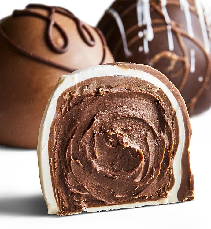 Irish Coffee Truffle - Dark chocolate center blended with Irish coffee flavor, dipped in milk chocolate, then in white chocolate.