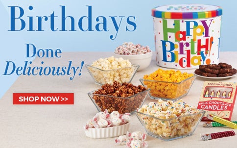 Our happy band of popcorn poppers has been delighting people with gourmet popcorn and delicious snacks and gifts since 1979. Whether you're shopping for family, friends, teachers or business associates, The Popcorn Factory® has great gourmet popcorn gift ideas for every occasion: birthday popcorn, gift baskets, graduation popcorn, college gifts, student care packages, movie popcorn or game night popcorn, kids pop corn gifts, popcorn balls to eat and decorate, corporate parties, business events, special times with loved ones and every holiday under the sun. We even offer sugar-free popcorn, too!