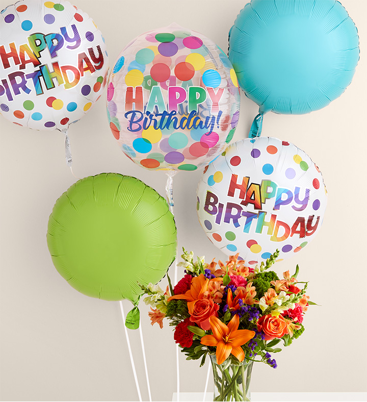 NEW Because birthdays can never be too fun, we paired colorful, zesty blooms with an equally spirited gathering of balloons. A Local Artisan Collection exclusive, the bouquet of roses, Asiatic and Peruvian lilies, and other flowers in vibrant orange, hot pink, and yellow arrives beautifully arranged in a glass vase. The five helium-filled balloons are just as lively and lovely.