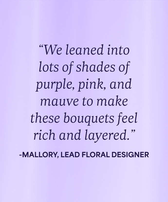 Seasonal shifts influence the specific blooms while keeping the violet-to-blush palette consistent. Spring often highlights tulips, hydrangea, lisianthus, and garden-style roses with soft luminosity. Summer brings fuller hydrangea, airy lisianthus, and orchids that withstand warmer temperatures. Autumn leans into deeper violets and plum-leaning roses with textured accents for added dimension. Winter relies on roses, orchids, and long-lasting alstroemeria to sustain color and form in cooler conditions.