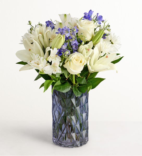 NEW Delphinium add a sprinkling of fairy-dust blue to this otherwise all-white gathering of roses, lilies, and other blooms. The result is a winter wonderland of a bouquet, certain to cast a magic spell on those who receive it.