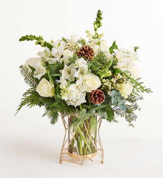 NEW As fresh and vivid as a field blanketed with newly fallen snow, our crisp white bouquet features roses, snapdragons, Peruvian lilies, and more accented with Christmas greenery and pinecones. It arrives in a gleaming metal-and-glass vase that adds to the sparkle of the holidays.