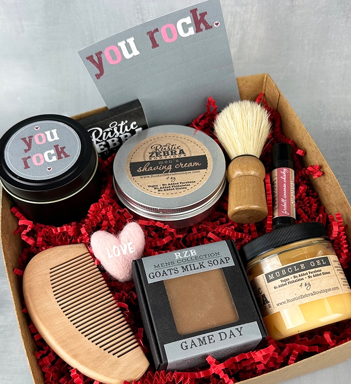 This thoughtfully curated gift set features a hand-poured soy candle in a sleek black tin with a white birch aroma, a custom matchbox, shaving essentials, a natural fireball cinnamon whiskey flavored lip balm, muscle soothing gel, a "game day" scented goat’s milk soap bar, a small felt heart, a wooden comb, and a personalized greeting card. Perfect for self-care or gifting, it combines premium grooming, relaxation, and a personal touch in one stylish package.